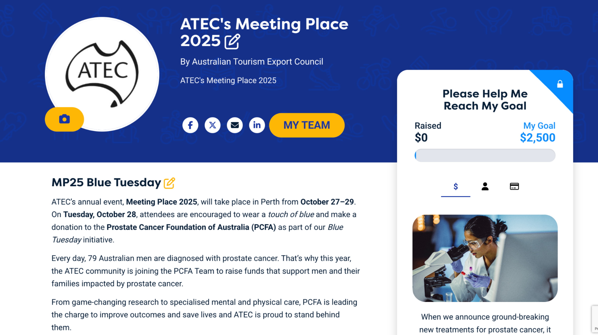 This year, ATEC is proud to continue our tradition of supporting important causes, and we’re excited to be fundraising for the Prostate Cancer Foundation of Australia (PCFA) during Meeting Place 2025. Join us on Tuesday, October 28, by wearing a touch of (or a lot of) blue and participating in our fundraising activities to support the Prostate Cancer Foundation of Australia's mission in cancer research, prevention and patient support.
